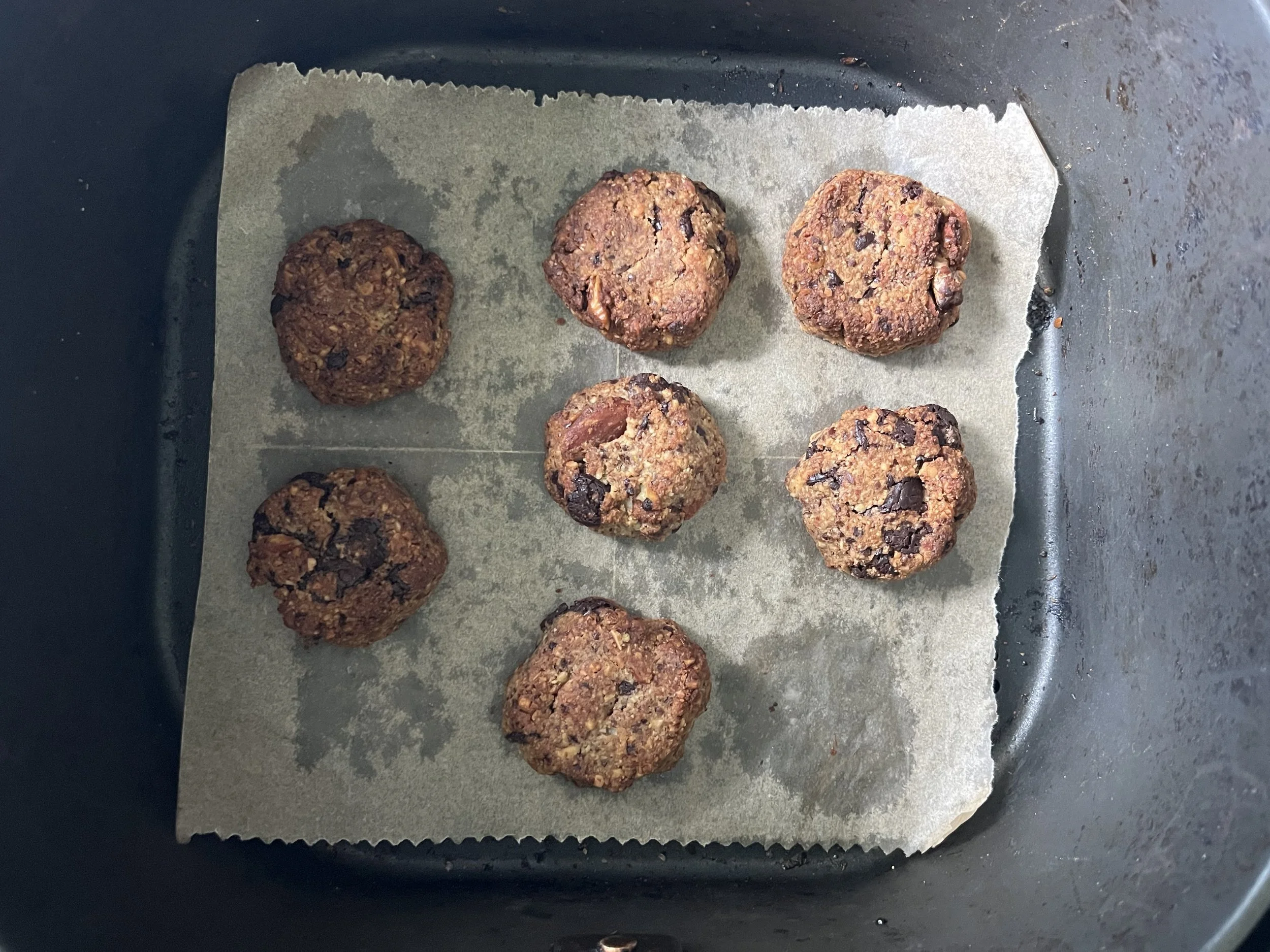 Backen im Air Fryer: Den Boden mit Backpapier auslegen, Kekse hineingeben und 7-9 Minuten bei 175 Grad backen.